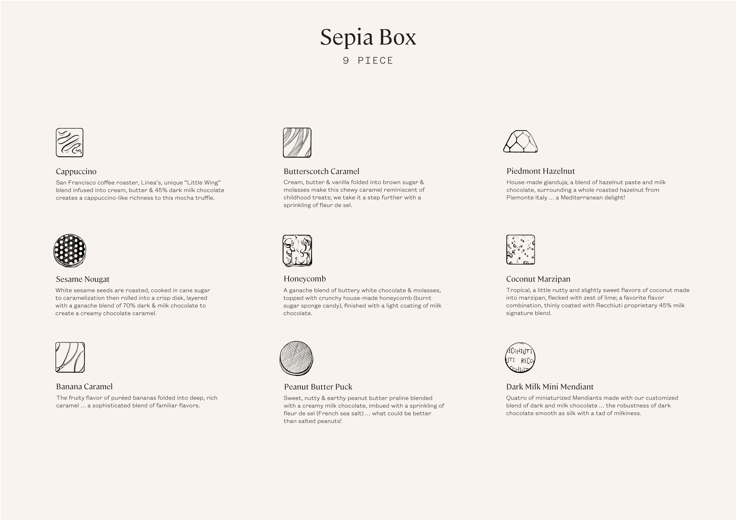 Gift the ultimate chocolate experience with the Sepia Box; our signature assorted chocolate gift box showcasing the artistry of milk chocolate. As the elegant sister to our all-dark chocolate Noir Box, this artisan chocolate box highlights the softer, more decadent side of our craft.