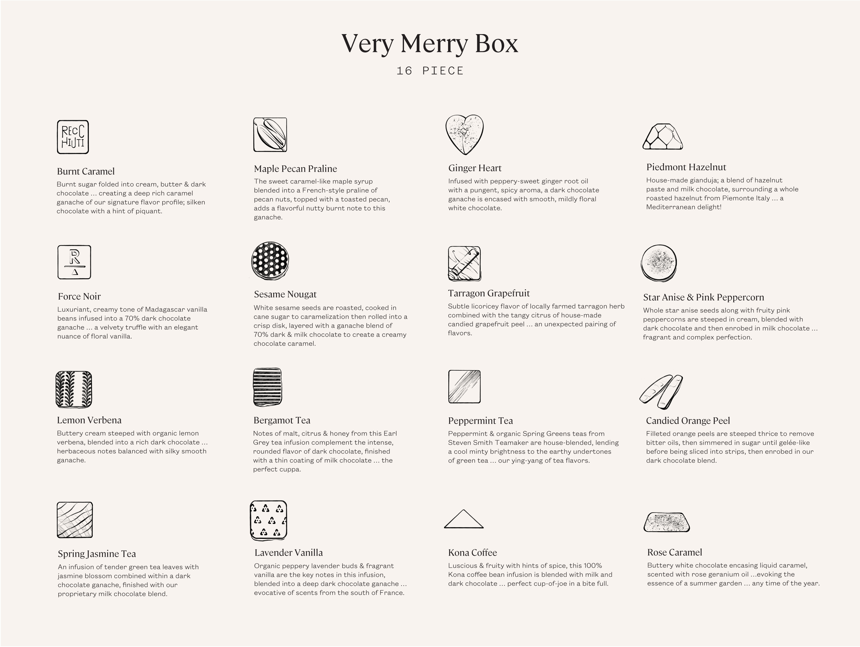 Celebrate the season with our Very Merry 16, a handmade chocolate confections collection that embodies true festive indulgence. Each piece is crafted with meticulous care, blending the art of chocolate-making with the warmth of the holidays using our original flavor profiles. Prepare to be captivated by the exquisite collection recognized as the New York Times' Wirecutter Best Chocolate Box.
